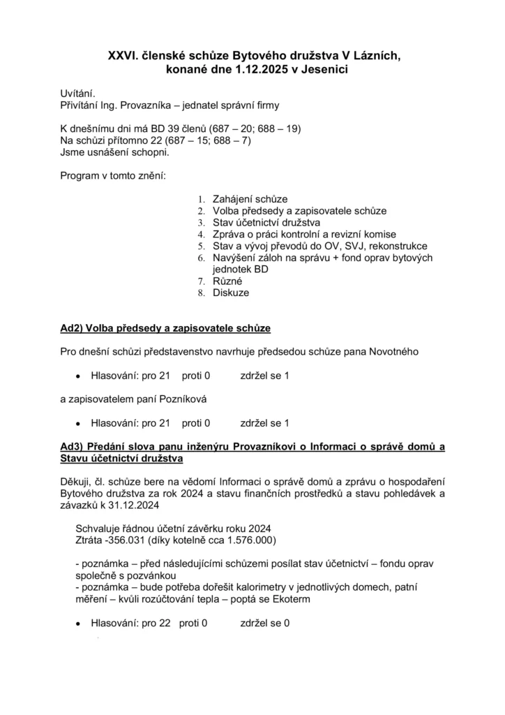 XXVI. členská schůze Bytového družstva V Lázních – 1. 12. 2024